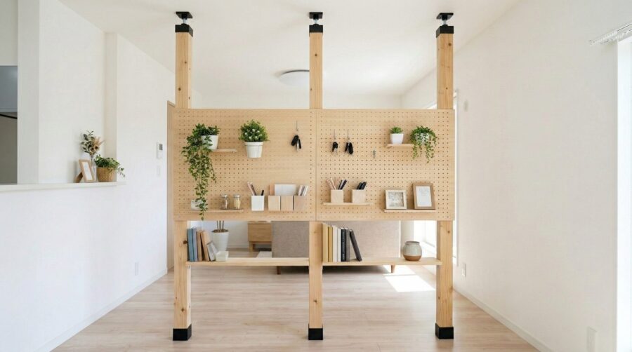 立てた支柱に有孔ボードを固定すれば、壁一面を機能的な収納スペースへと変貌させられます。