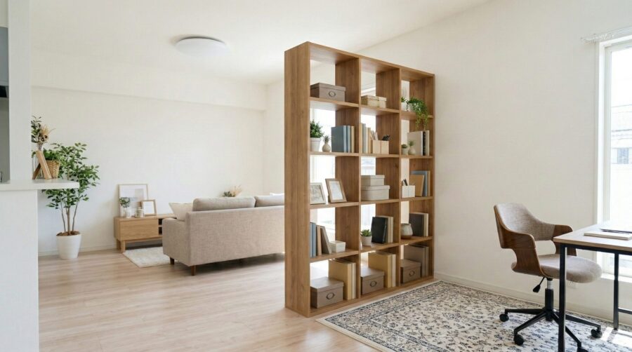 これにより、リビングとワークスペースを緩やかに分けることができ、さらに両面から物を出し入れできる利便性も生まれます。ただし、地震の際に倒れないよう、床との接地面に滑り止めシートを敷くなどの対策を忘れないでください。