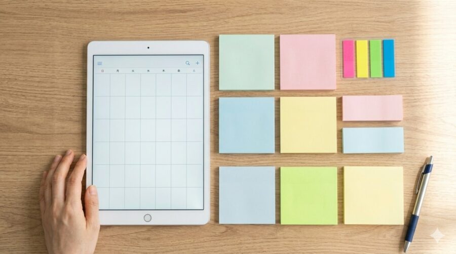 具体的な運用方法としては、外出先で確認が必要なスケジュールはデジタルへ、デスクで集中して取り組む作業は付箋へ、という切り分けが基本です。